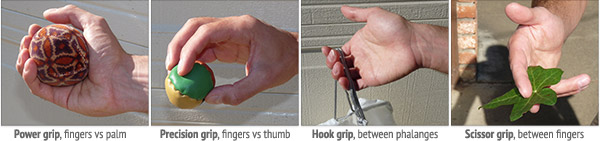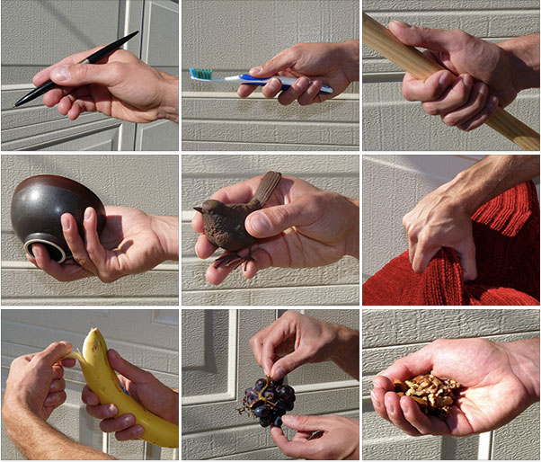 那么,我们如何操作呢?事实证明,我们的手指有着令人难以置信的丰富表现,我们能不去进行任何思考而即兴发挥。在每一幅图中,注意所有手指的位置,施加压力的对象,以及物体的重量是如何平衡的: