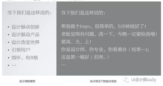 下面这张图,基本上就是我们UED同学的现状,左边是梦想,我们希望用设计驱动创新,做出有情怀、有B格,还能驱动产品改变世界的设计…