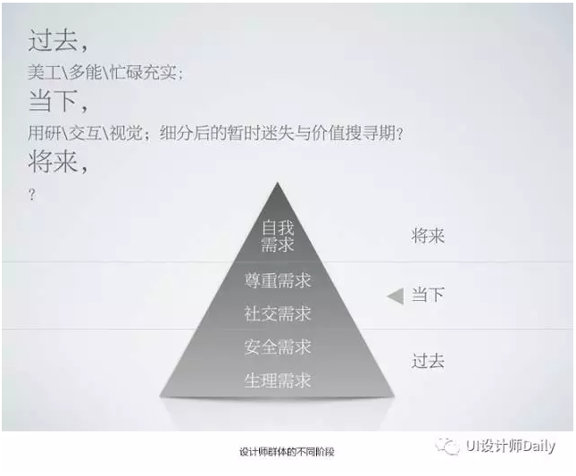 这个时候,互联网用户体验形成了专业细分,专业细分其实是一次有重大意义的探索,这种探索推动着“美工时代”向“专业细分时代”转型,这种探索也折射出我们这层人正在思索,思索行业何去何从的问题,即从何而来,又到哪里去。而当下的我们,正在经历这个过程。