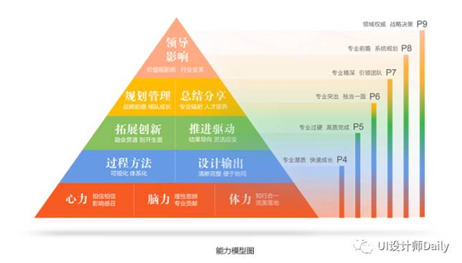 这里是我们抽象出来的能力模型的完整图,我们做设计的基础要求就是心力、脑力、体力。在阿里巴巴,这三力也是较为重要的。在我们这一行,从P5到P9的UED同学,是从对技能的要求,到做计划的要求,以至到行业影响的要求。但目前现状,很多设计师会集中在技能这一块,就是图中所示的过程方法和设计输出,这就是技能输出的模块。但专在这一块,是难成为大师的——我之前就讲到,我们并非产品的制造者,所以我们要在计划执行、影响力,增强自身推动力,才有可能拿结果,将自己的专业能力极限放大,最终打造个人品牌。和业务方对接,甚至也可以介入到他们的决策,这些才是我们要的感觉。