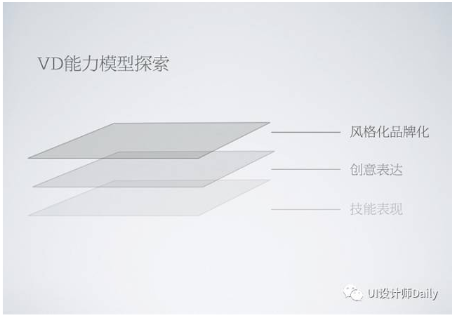 一旦UXD具备了我们理想中的能力模型(图上),可能大部分视觉设计师没什么事可做了,因为UXD兼备出视觉的能力。加之目前我们建设中台,未来可能都是智能化的设计,视觉设计师发挥的空间就更小了。这种让视觉设计师最痛的时候,便是驱动其转型的时候,催生真正的视觉设计师的时候,我们称之为“创意型”视觉设计师(VD)。这类视觉设计师,越往上走,其创意理念和意识都是特别强的,后面我会和大家一同畅想VD的能力模型。