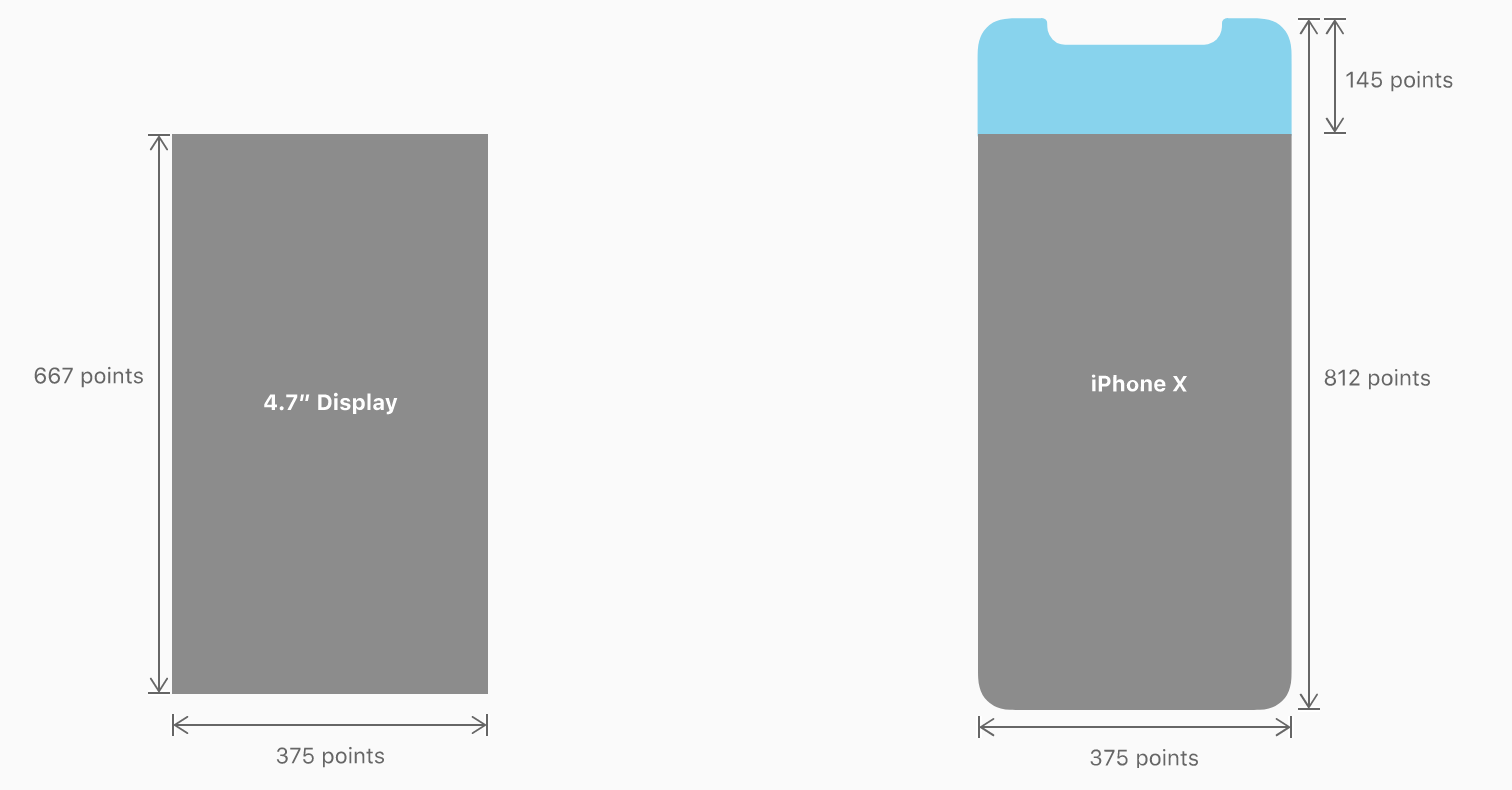 同样的,iPhone X上的全屏设计稿在4.7英寸iPhone上显示时也会被剪切或出现左右黑边。要确保重要的内容在不同设备上显示相同的尺寸。