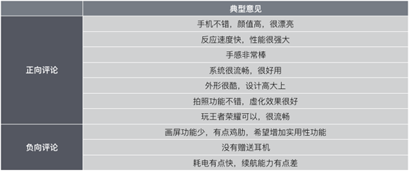 从条形图我们可以看到积极评论只有64%,而负面倾向的评论有26%,说明产品本身确实有很多值得改进的地方。到此,可以进一步对情感评论进行下一步挖掘,这里我们做了典型意见分析,依然调用的是BOSON API,结果如下表所示: