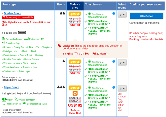 如果你之前用过Booking.com,你大概已经注意到一些套路(希望你没被诱惑!),它会引诱你去预订你正在浏览的房间。