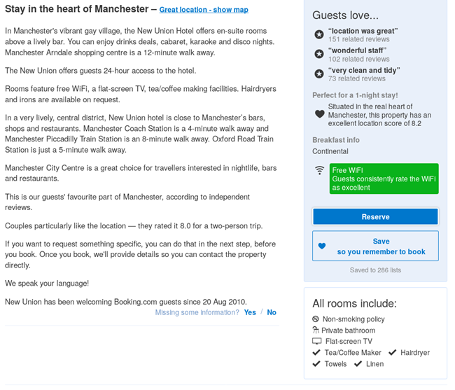 这里有一个极端的例子,也就是我目前住的酒店,New Union。从Booking.com的页面上,你不会觉得有什么不对的地方,是吧?