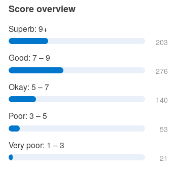 关于评分,有些有意思的地方值得注意:首先,如果是适度的负面评论,就会给7分,满分10分。如果再差一点,就会给6点。结果,所有评分综合下来是7.6,这分数看起来还不赖,而且这个分数分布看起来也并不会糟糕。