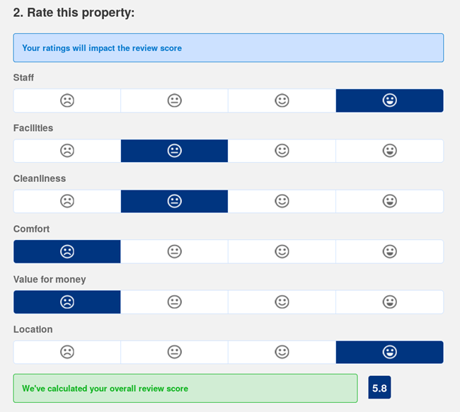 不像IMDB或者亚马孙的评分流程,你只要对一个产品或者电影,给一个星星数就好。而当你评价Booking.com的房子时候,他门会给你很多参考因素:员工,设施,位置,整洁度,舒适度,价格等。