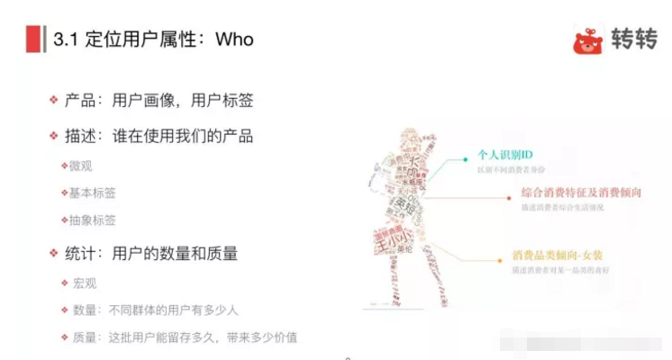 Who 可以拆解为「描述」和「统计」两层。「描述」从微观层面讲述用户是谁,有「基本标签」和「抽象标签」。「统计」则从宏观层面回答用户的数量和质量问题。