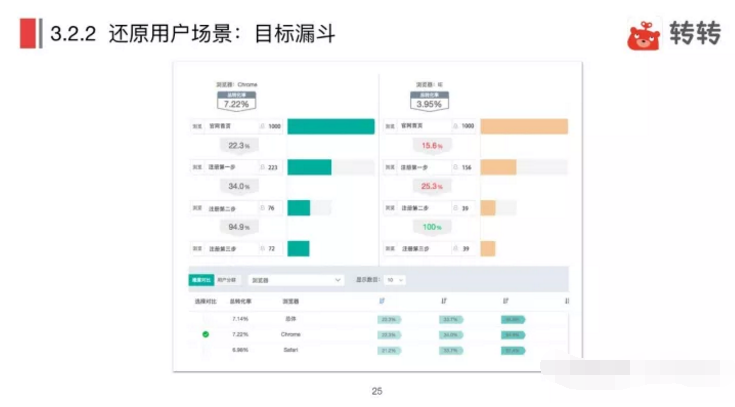 短漏斗在分析过程中,可以根据漏斗行为的每个过程做纵向分析,也可以根据漏斗切分的维度,做横向分析。以 GrowingIO 做的漏斗分析为例: