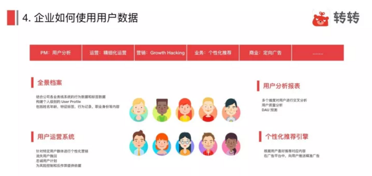 在如何使用数据方面,我按照职能和产品分成了两条线,并简单地挑了 CRM 和 个性化/产品质量提升 两点举了个例子: