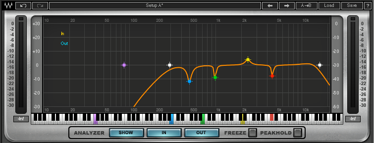 这幅图是一个典型的曲线型参数均衡器软件。X轴代表频率(赫兹),Y轴代表振幅(分贝)。着重看图上频段的部分,我把所有低频段移除了,并且减少了一些窄频段。