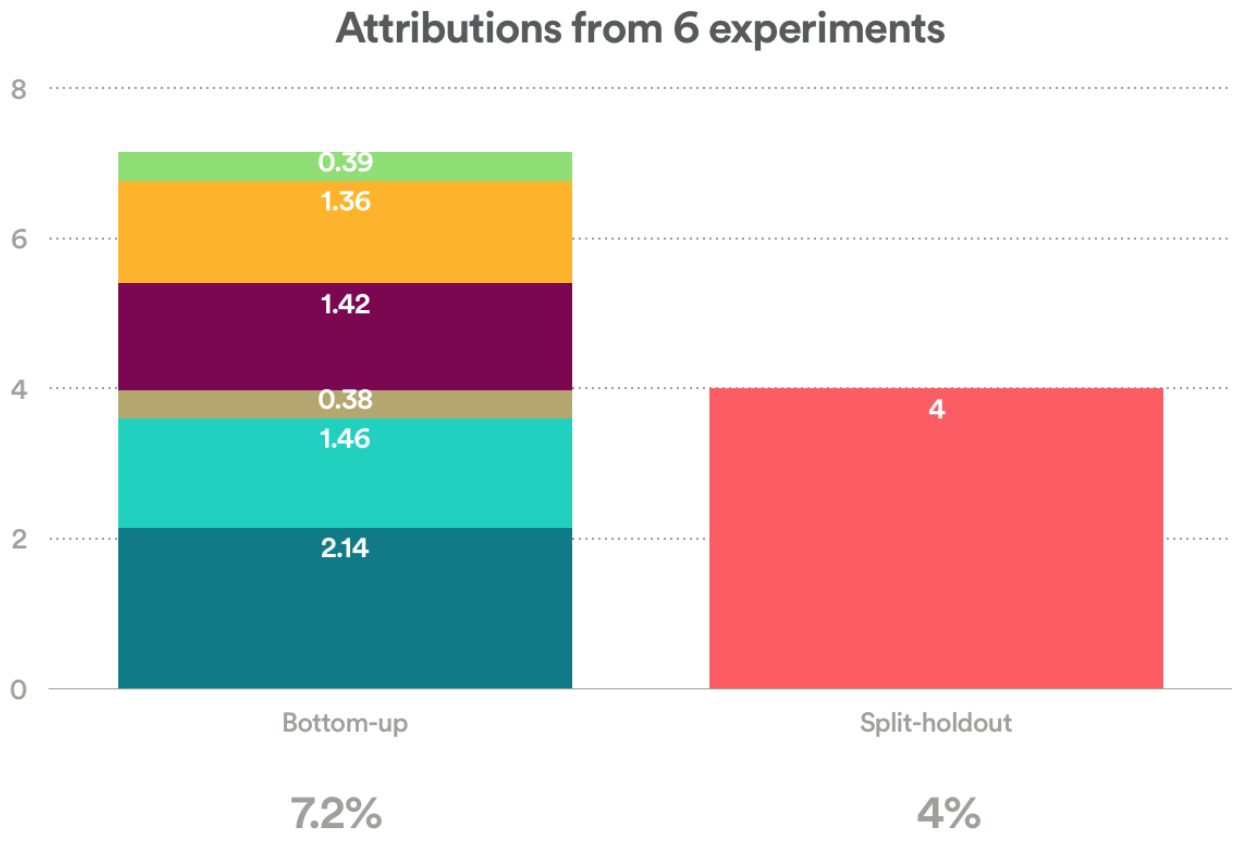 在自下而上估算(bottoms-up calculation,图左)中的每个数据是每次实验中测验指标的增量,而图右则是实验方案在验证组中的指标表现。前者的求和与和后者均是对于产品方案的综合效果的测量,但在绝对值上前者的总和明显超出了后者。我们该怎么解释两种方法得出的数据差异呢?