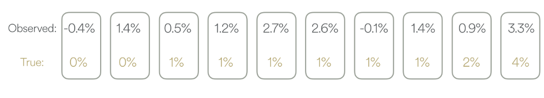 假设我们进行10次A/B测试,每一次测试的标准差都是1%。我们在每次测试中都有足够的样本参与,然后得到每次测试效果如下图中的第一行数据。同时,图中的第二行数据代表了真实效果,但我们暂时假装并不知道它们。