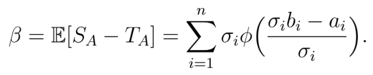 从上面的公式中我们能够很直接的得到赢者诅咒的无偏估计方法。假设真实变量 aᵢ 和 σᵢ² 都是已知的,那么我们就能推导出偏差E[S_A -T_A]的公式如下: