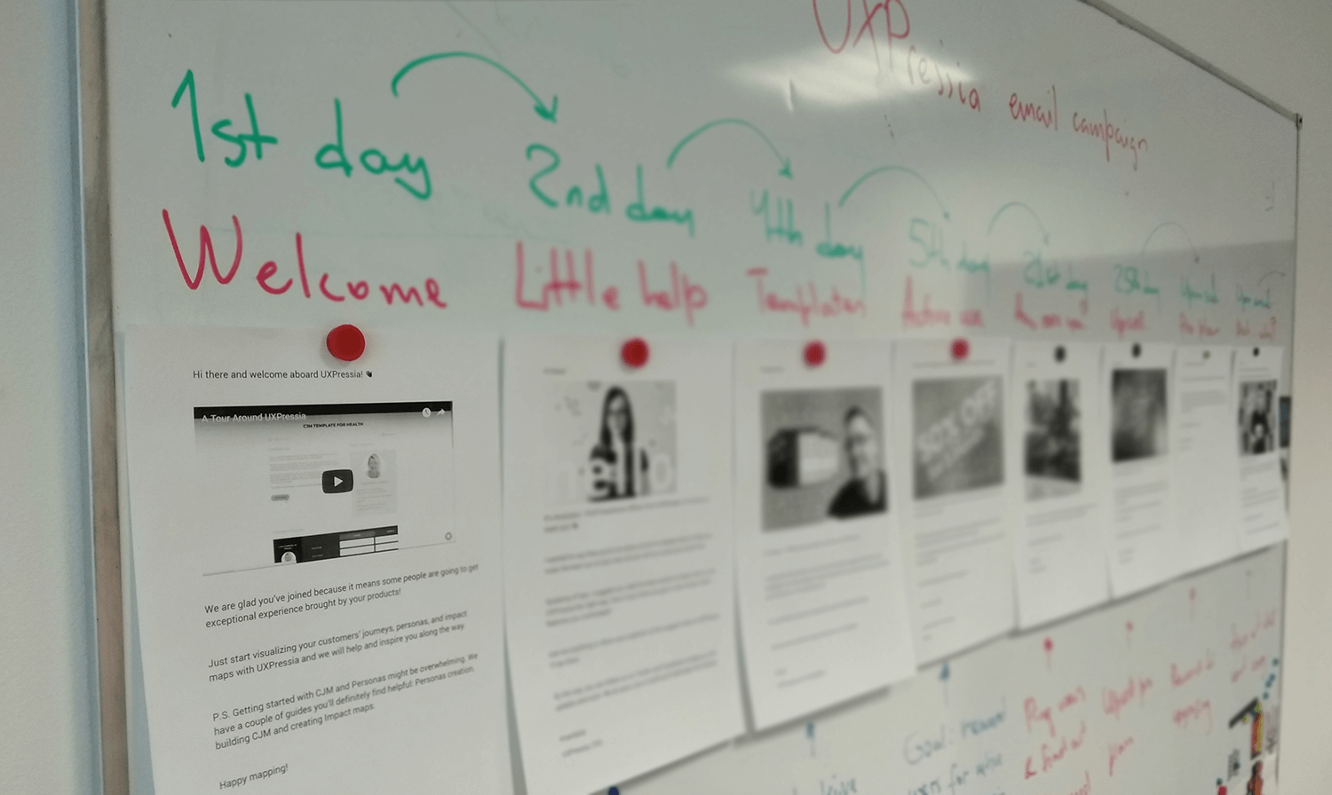 我们在白板上保留了这些打印好的邮件一段时间。在这之后的某天,一场漫长且乏味的用户旅程地图研讨会后,我们正在喝咖啡,一位参与者瞥见了这些仍在白板上的邮件,便询问:“各位,这个旅程地图是用来做什么的?”