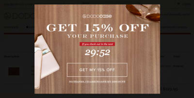 当你在 DODOcase 购物过程中决定离开时,一个弹窗推送的优惠券可能就会让你改变想法。不仅是因为网站提供了15%的优惠,可以解决你因为价格而离开的问题,而且该弹窗提供了一个倒计时,这样你可以明确地知道优惠券时效,弹窗中给出了两个明确的选择按钮,让你选择使用优惠或是将其存入账户。