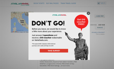 然而,ItaliaRial 的一个类似通知却不受欢迎。弹窗中的行为召唤按钮是邀请用户填写问卷,用户很容易忽视回答问题可以获得$10代金券。弹窗意图重在收集用户反馈,而不是让用户完成结账过程,这对任何一方来讲都不是有效的offboarding设计。