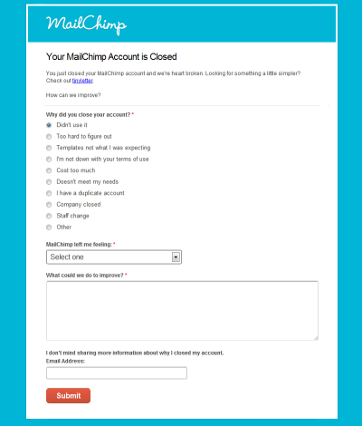 MailChimp在用户注销账户前询问用户态度。