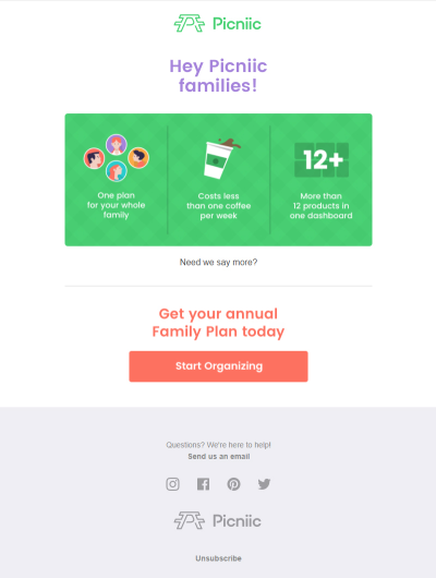 Picniic 将退订链接放在同样底部的位置,但是清楚地标为“退订”——用户如果想退订邮件就很容易看到这个按钮。该按钮的另一个易用性体现在,这个链接独立出来,非常明显,无需从许多链接和信息中寻找。