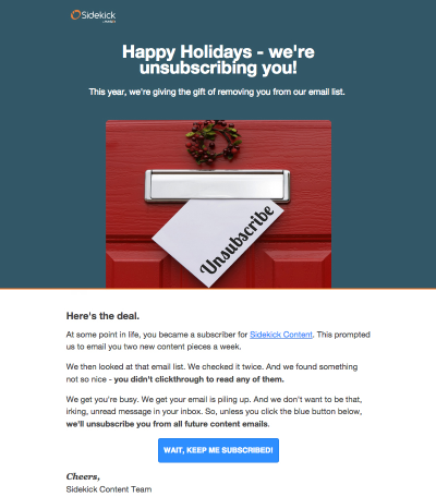 Sidekick Content是一个极端的例子,它将退订作为节日礼物发给不活跃的用户。与其他案例不同的是,这里你需要点击一个按钮才能继续订阅。这种方式也存在失去更多活跃用户的风险,但风险相对较小,因为这封邮件只会发送给很少打开订阅邮件的用户。万一用户打开了邮件,他们可能会被邮件内容打动并继续订阅——但如果用户没有打开这封邮件,就会被自动退订,这样对大家来说都是好事。