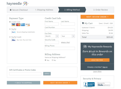 Hayneedle提供了另一种截然不同的结账体验。不仅将各个步骤都呈现在不同的界面上,而且清楚地标出下一步“Next Step: Review Order”,这样你就知道点击当前按钮后不会直接付款。