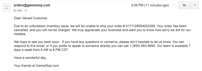 不幸的是,即使你已经通过含混不清的结账过程购买了某一商品,你也未必能顺利结束整个购买过程。如果你GameStop的订单被取消了,你可能会收到以下信息: