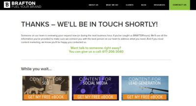 最简单的提供确认的方法是使用感谢页面,即用户在网站上提交表单后,跳转到一个界面告诉用户他们已收到反馈。以下是Brafton的例子: