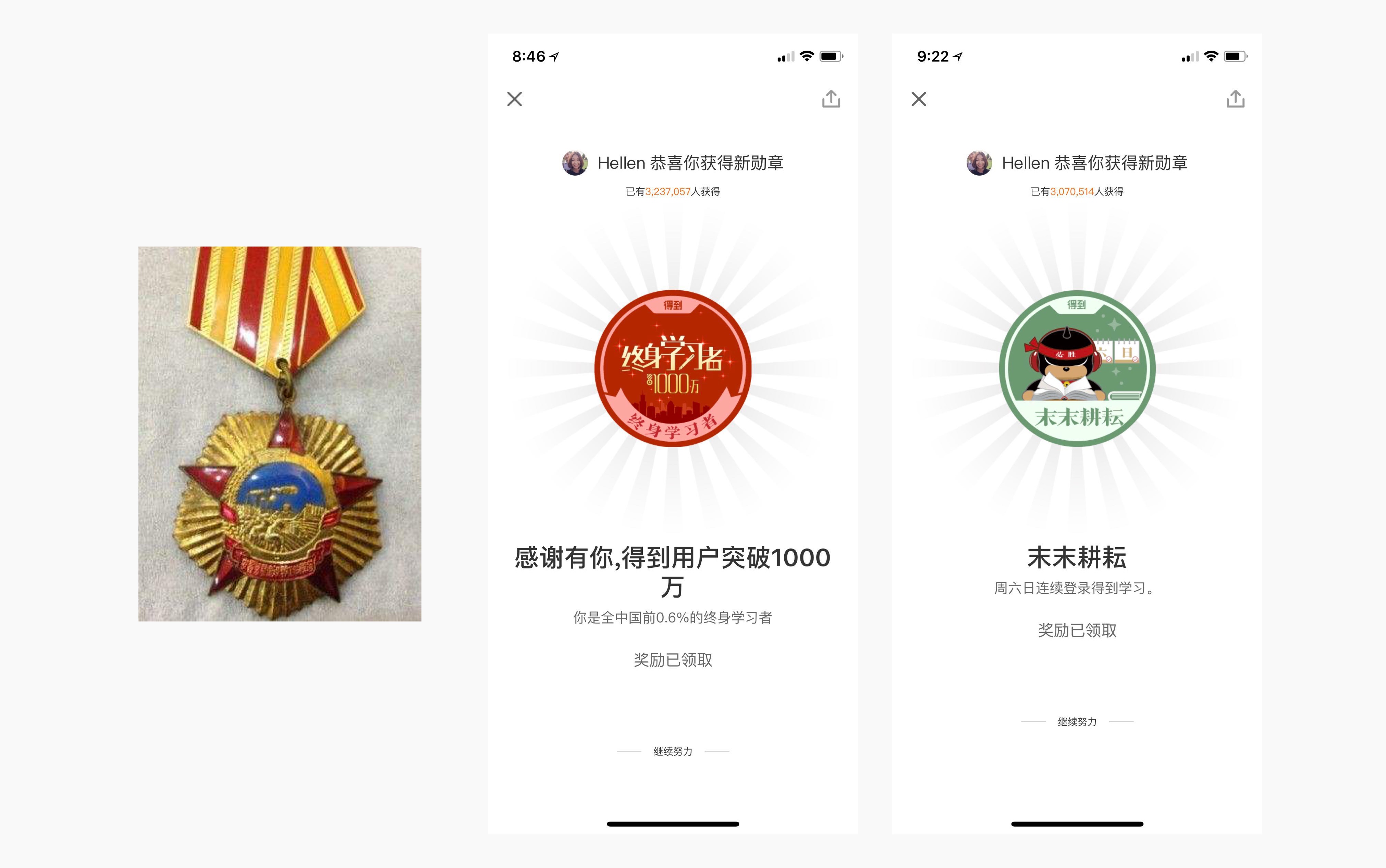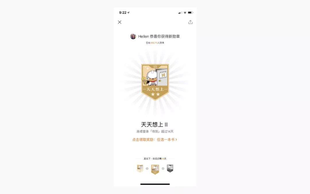 当用户参与平台的互动,对用户的付出给予相应的表扬与肯定的感受。例如:勋章的设计,给用户付出14天学习后的奖励。