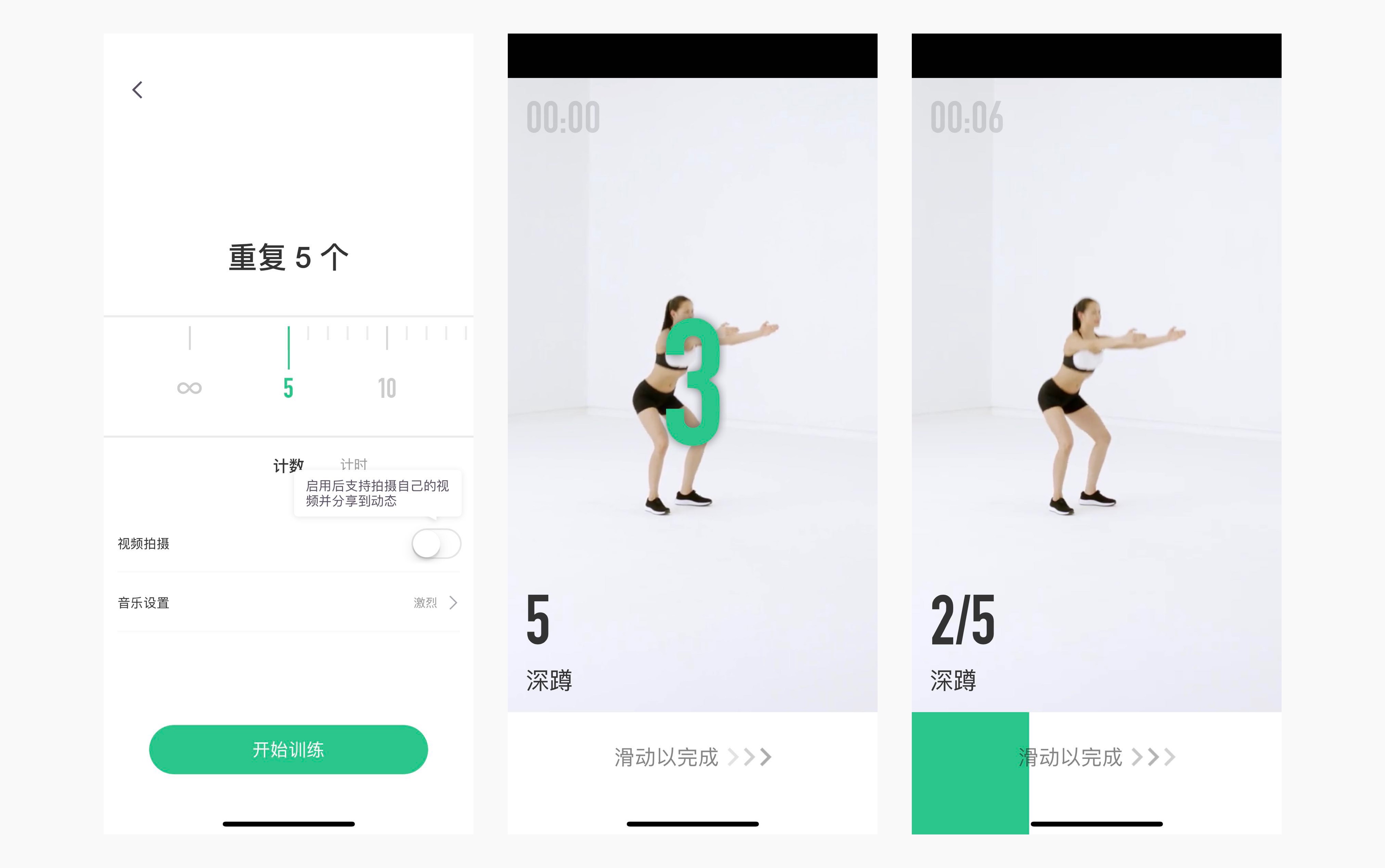 例如:keep在进入训练时,通过对自己的预设结果,倒计时、以及进度展示、训练完结果这种一系列行为的被动可以唤起用户心中训练的仪式感。