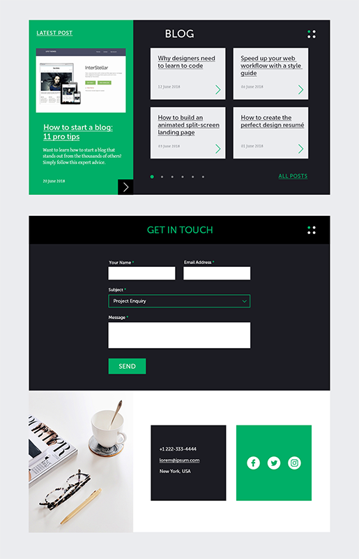 这个线上作品集中,复用使用绿色贯穿于整个页面,创造出一种关联性和重复性。(设计师:Anahat Rawal http://bit.ly/Anahat_Behance)