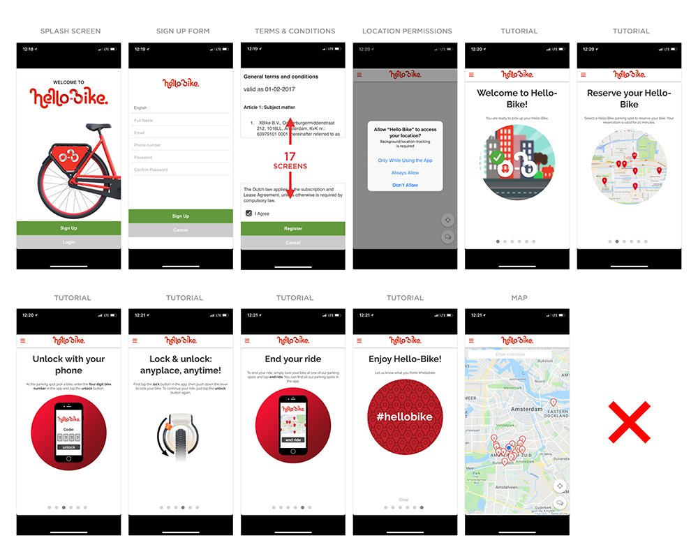 设计师的思考过程是:“我知道什么是新手引导。它是启动页、注册页,还有可以滑动的教程。”实际上的用户体验却是:填写表单,滑动浏览长达17页的条款与条件(是的,你需要滑过全部的页面),提供定位权限(因为“需要后台定位”),再跳过6个屏幕的教程。而教程传递的主要信息无非是“欢迎使用Hello-bike”。