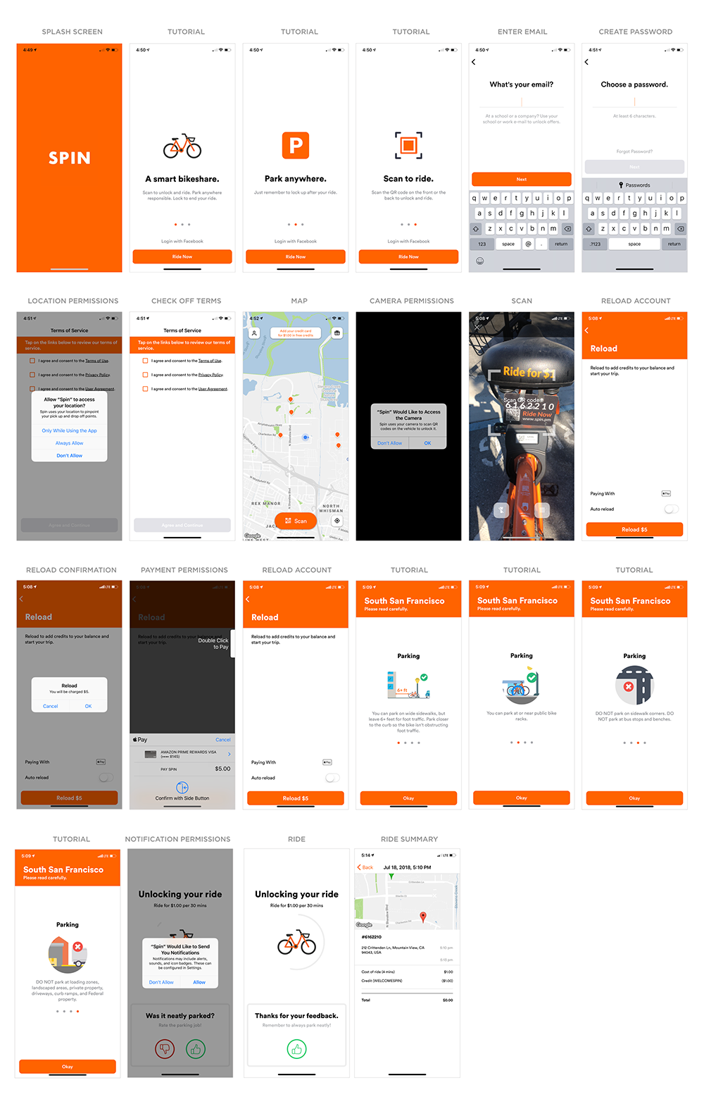 在放弃了 Hello-Bike 和 Jump 之后,我成功完成了 Spin 单车的新手引导。这并不是说 Spin 没有什么改进空间。当设计移动端的新手引导时,不仅要考虑我们请用户做什么,还得考虑请求的时机。Spin 的新手引导从教程开始,介绍它们很智能,用户能在任何地方停车,扫描车上二维码就能骑。