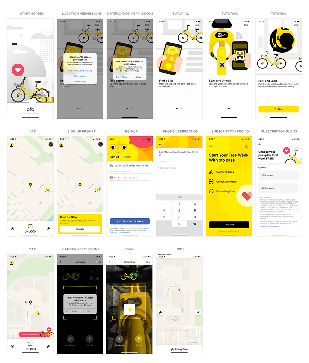 到目前看来,Ofo 的新手引导流程看上去很类似:请求定位和通知权限,但不提供任何有用的说明;前置的教程;一个验证手机号码的流程,请求相机权限等等。