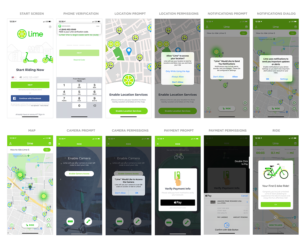 在他们的新手引导中,Lime 巧妙地驾驭了许多重大挑战:创建账号/验证、获取定位、相机和支付权限——这是你骑车所需要的最少步骤,就这些。Lime 之所以做到,是因为它向用户说明了怎样逐步完成骑车的目标,它努力克制自己的需求,它借助了移动设备的原生功能,打造快速、简单的体验。