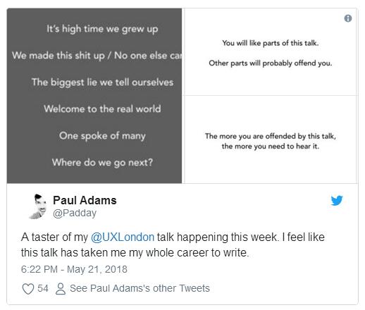 在今年的“伦敦用户体验对谈”活动中,第一轮设计分享中压轴的是保罗.亚当斯的名为“视脐而思”的演讲。几天前,他就曾暗示,此次他将要谈论的内容,可能会让部分行业人士感觉不适。