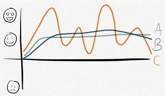 C公司也瞄准了同一个用户群,但认可并代表用户的信仰(它有您认可的目标,很鼓舞人心并有雄心壮志)。共同的价值观将其提升一个档次并区分了体验。这里也会发生一些有趣的事情——就像一个人,一个企业的价值观塑造了他们的行为方式。没有人是完美的,或被每个人喜欢-通常我们愿意原谅他们的一些缺点,因为他们的优势的大小。所以由于峰值的高低,体验中的一些低谷点可能变得可原谅。