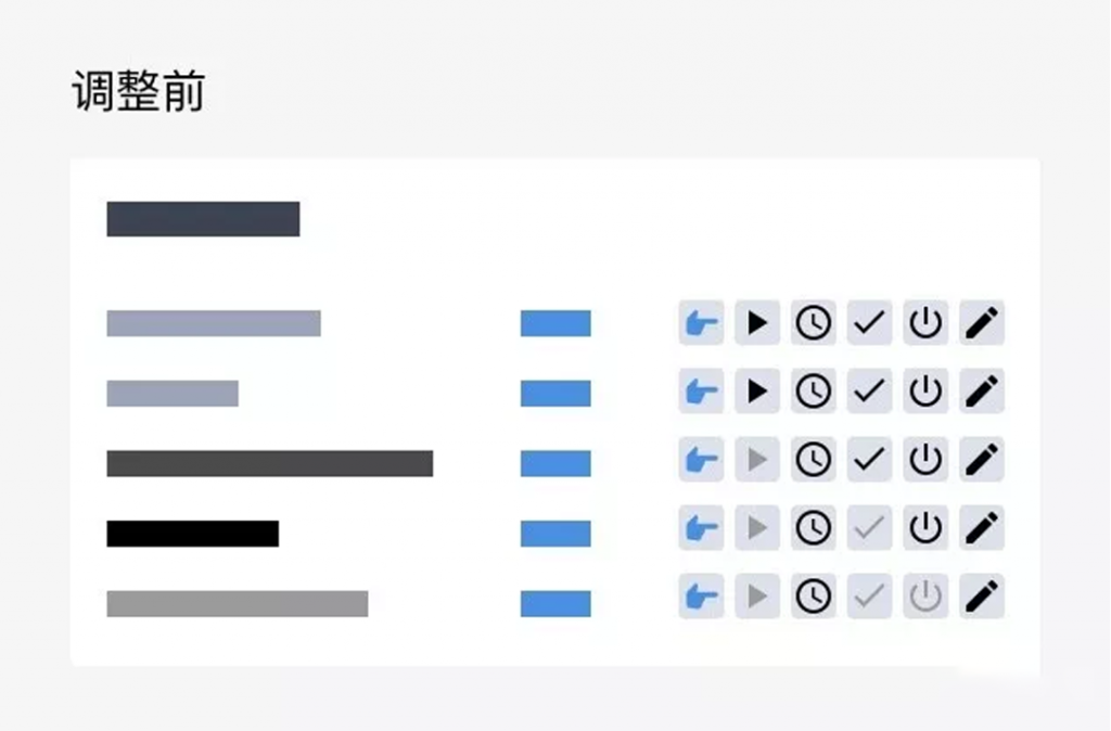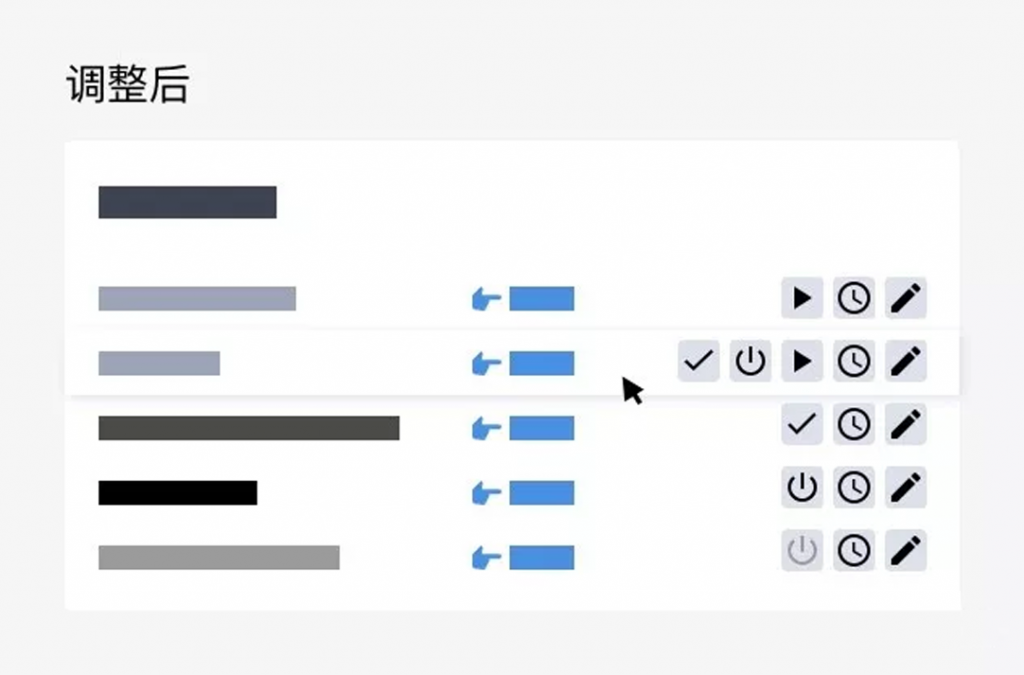 上图是一款B端产品的“列表模块”,附带有很多操作,功能很强大,我们对信息有做抽象处理,其中最左侧不同灰度的色条代表不同状态下的目标名称,蓝色的色条代表“被指派的人”,蓝色的操作代表“指派操作”等,我们不难看出不同状态的目标所对应的操作也有微弱的区别,主要体现在“当前状态下是否可以执行该操作”。