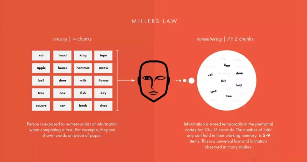1956 年乔治·米勒发现人类头脑最好的状态能记忆含有7(±2)项信息块,在记忆超过9 项信息后人类的头脑就容易出错。也因此,神奇数字 7±2 法则经常被应用在移动应用交互设计上,如应用的选项卡不会超过 5 个。