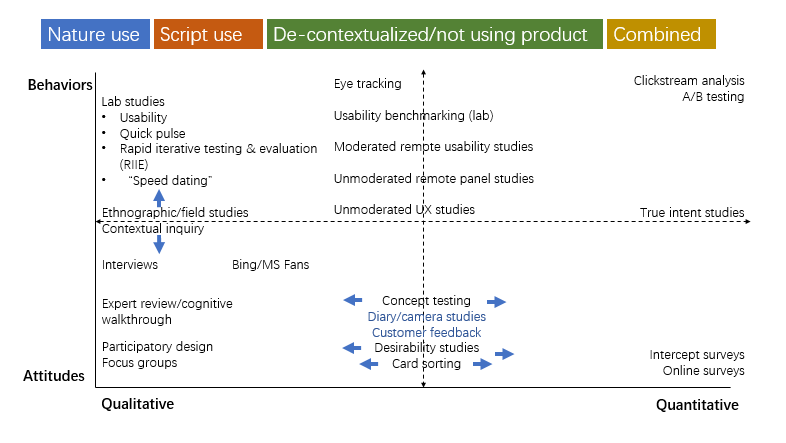 区分和概括用户体验研究的方法主要依赖3个重要的维度:行为还是态度、定性还是定量,涵盖用户情境还是去用户情境。用这三个维度可以为任何方法找一个位置。