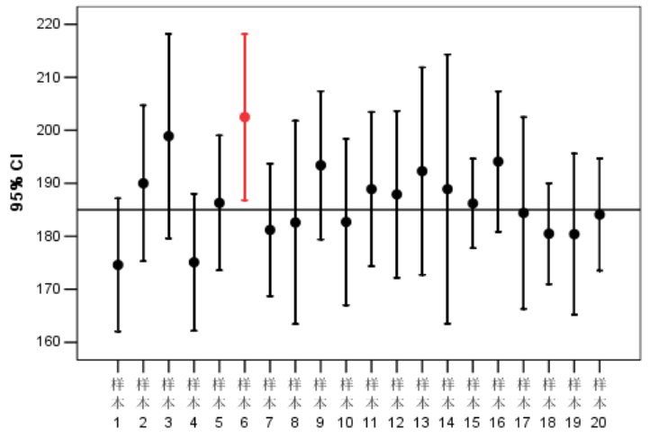 假如相同规模的抽样调查进行多次, 抽样均值在真实均值的上下波动,相对于整体均值的偏移波动就是抽样误差,而这个误差的分布是符合标准正态分布的,例如下图: 横轴为整体的均值,圆点是每次抽样的均值,而红色那次抽样就是加上误差后都未覆盖到均值线的情况);