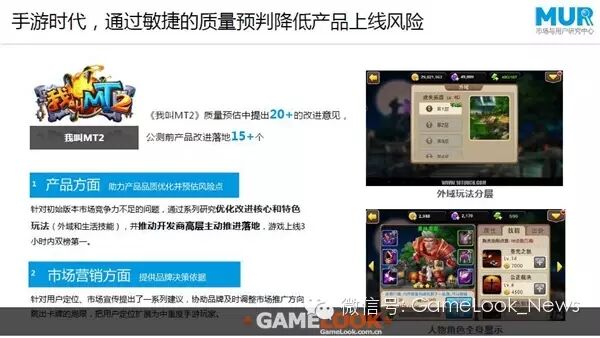 对于腾讯的合作伙伴,腾讯的资源是非常开放的,用研也是一样。比如《我叫MT2》,在《我叫MT2》质量预估中我们提出了20个以上的改进意见,公测前产品改进落地15个以上。