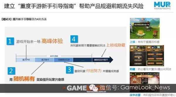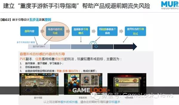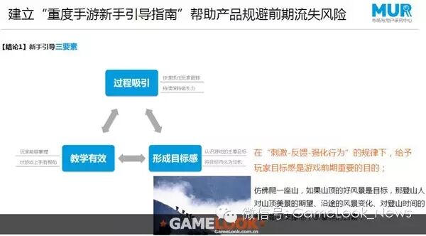 通过研究,我们都出一些结论。第一个结论是新手引导三要素:第一个是过程吸引、第二个是教学有效、第三个是形成目标感。其实前面两点大多数策划都可以看到,但是第三点是最重要的一点,就是需要让玩家形成一个目标感,目标感就是说玩家要通过新手引导这样的过程,去认识一款游戏的主要目标在哪里,把这个目标转化为玩家玩的动机。