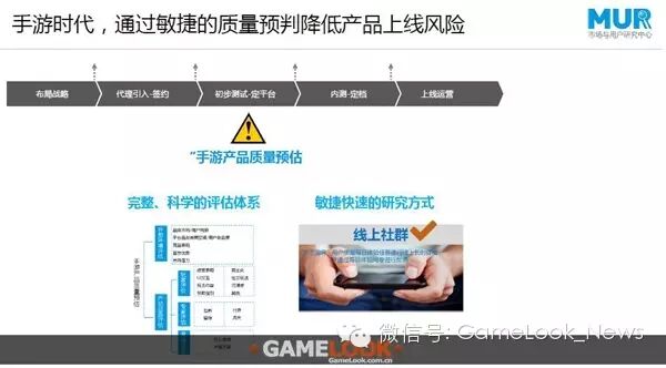 作为用研,就要主动的拉起手游产品预判的项目。这个项目是非常敏捷做的,首先搭建非常完整、科学的评估体系,采用这样的评估体系,可以非常敏捷快速的进行线上社群调研的研究方式,可以非常快速的对手游产品在产品上,以及在营销上面的风险点进行预判。