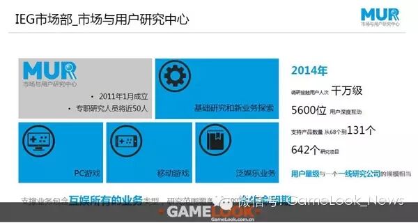 腾讯互娱2011年1月成立市场与用户研究中心,2015年调研接触用户次数达到了千万级,目前支持的产品数量达到了131款,有642个研究项目。吕品现场说道:“市场与用户研究中心整个支撑的业务包含了PC游戏、移动游戏和泛娱乐业务,另外我们会做一些基础研究和一些新业务的搜索。我们的用户量级与一家一线研究公司的规模相当。”