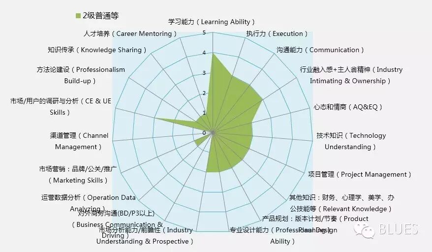 下图是某知名互联网公司的产品经理能力成长雷达图,是2级普通等,什么概念呢,一般的本科毕业生到新的公司,一般从1.2(1级普通等)开始打怪升级,研究生从1.3开始打怪升级。