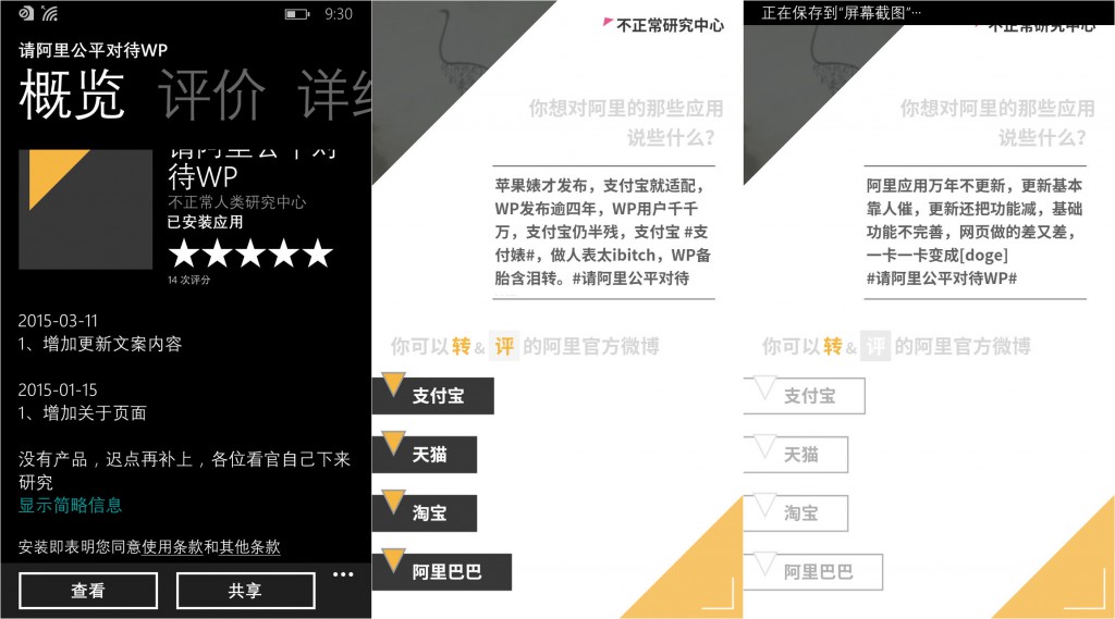 但是到了 WP 支付宝客户端就是另外一回事,WP 上的支付宝,缺少许多必要的功能,扫码、生活服务这些功能都没有,功能性上严重滞后于其他两个平台。上一次更新还是去年 8 月,添加了余额宝功能。这种开发进度上的滞后一直受到了 WP 用户的指责。我甚至还在 WP 的应用商店上找到了一个奇葩应用,叫“请阿里公平对待WP”,这个应用没有实际功能,唯一的用处就关联微博发微博刺激阿里系的微博帐号。