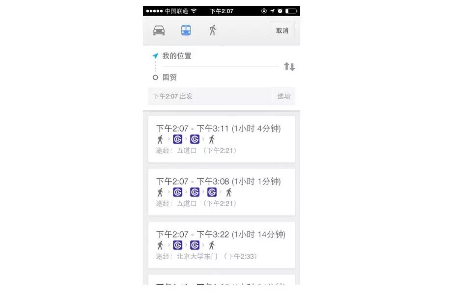 在Google Map中,如果用户想查询线路,就一定要输入起点和终点,这是无法省略的过程。但是在查询路线时,Google Map会利用定位功能自动将起点定位为“我的位置”,减少用户的操作。