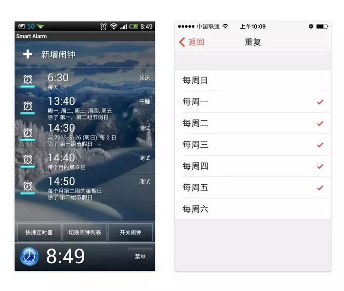 下图为两款闹钟应用,一款提供了非常强大的功能,在设置闹钟时可以有多种重复方式:每天、每周的某些日子、每周的某些日子和第N组节假日、仅第N组节假日、每隔N日、每月的某一日、每月第N周的某日……另一款只是简单的让用户选择每周几重复。如果是你,会喜欢哪款呢?